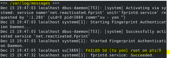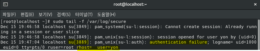 ์ฌ์ฉ์ yon์ ๋ํ su ์ธ์ฆ์ ์ผ๋ถ๋ฌ ์คํจํ ๋ค messages ๋ก๊ทธ๋ฅผ tail๋ก ์ดํด๋ณด๋ฉด FAILED SU (to yon) ์ ํ์ธํ ์ ์์