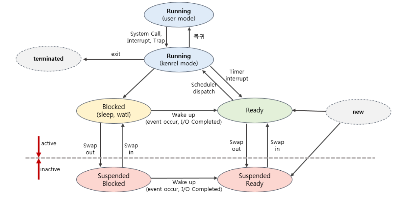 ๋ฉํฐํ์คํน ์ปดํจํฐ ์์คํ ์์์ ํ๋ก์ธ์ค ์ํ๋ CPU๋ฅผ ์ป์ด ์คํ์ค์ธ ํ๋ก์ธ์ค๊ฐ ์ค๊ฐ์ ๋ค๋ฅธ ํ๋ก์ธ์ค์ CPU๋ฅผ ๋๊ฒจ์ฃผ๋ ์ผ์ด ๋น๋ฒํ ๋ฐ์ํ๋ค. ํ๋ก์ธ์ค๋ ์ธ์ ๋ ์์ฑ, ์ค๋น, ์คํ, ๋๊ธฐ, ์ข ๋ฃ ์ค ํ ๊ฐ์ง ์ํ์ ๋์ด๋ฉฐ, ์์ฑ๋์ ์ข ๋ฃ๋ ๋ ๊น์ง์ ํ๋์ ๋ผ์ดํ์ฌ์ดํด์ ์ง๋๊ฒ ๋๋ค. ์ ๊ทธ๋ฆผ์ 5๊ฐ์ง ์ํ๋ก ํ๋ก์ธ์ค์ ๋ผ์ดํ์ฌ์ดํด์ ์ ์ํ๋ค.